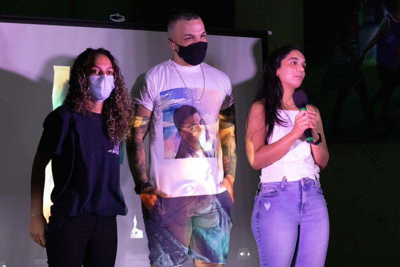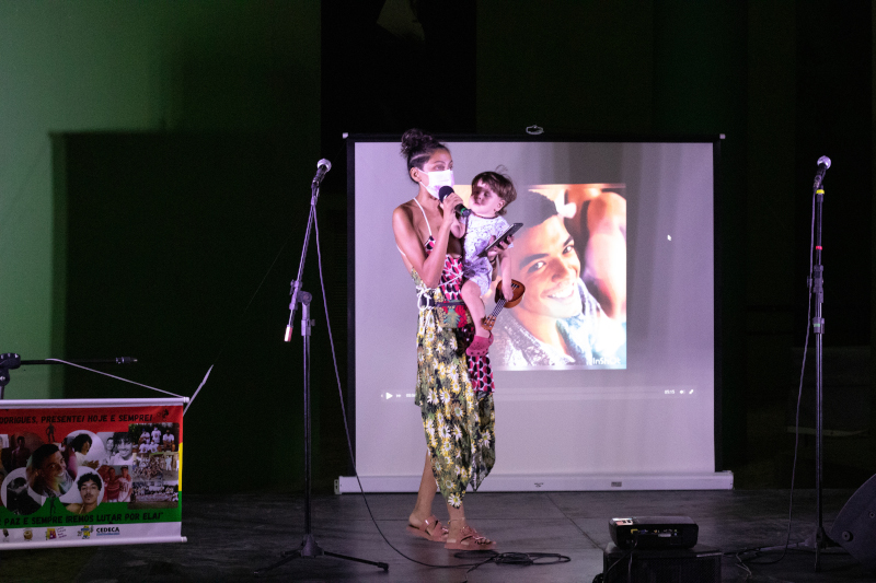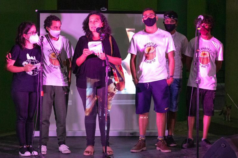 Representando o Núcleo Gestor do CCBJ, que também estava presente na noite, a gerente de comunicação, Isabel Mayara, saúda os presentes e deixa registrado o pesar da instituição. “O Centro Cultural Bom Jardim, sente muito por esta perda insubstituível de Geovane Xavier. Ao perguntar sobre a passagem de Geovane por aqui, a resposta foi unânime: um jovem que sorria com os olhos, com o coração, com a boca e com a alma. É com este sorriso frouxo que a família CCBJ, se une ao território do Grande Bom Jardim e a família de sangue para celebrar a jornada de Geovane”.