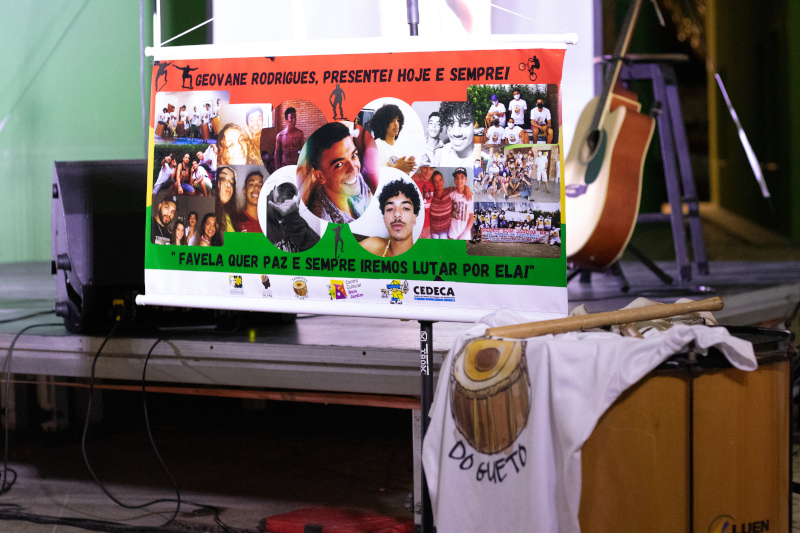 Uma das falas de Geovane foi relembrado e lida: “A luta é constante, e na rua estamos reivindicando nossos direitos por lei, sistema que nos sabota e acaba nos calando. Mal sabem que a juventude está se empoderando, lutando, planejando…Não precisamos de armas, pois não temos mente fraca, nossa arte é o que nos salva. Não salvamos a pátria. Acham que vão nos calar né? Mas estamos de pé, nossa voz se fortalece a cada momento. Sou da favela mesmo e levo a vida com arte, brincadeiras à parte, pois a luta é constante para quem está do nosso lado mediante a cada ataque”.
