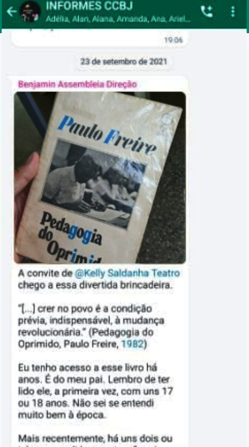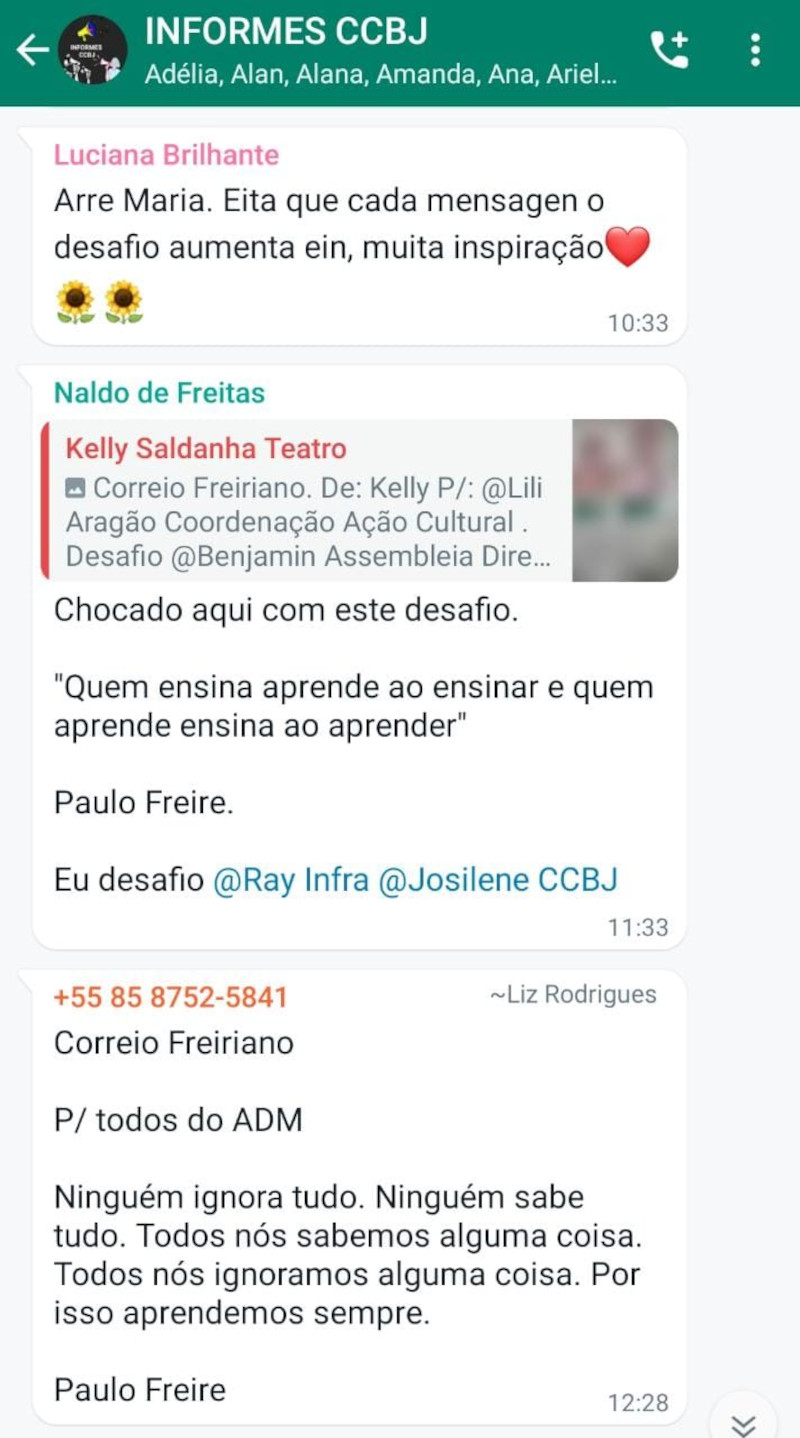 Na sequência, como extensão desse movimento o CCBJ lança também, a ação: correio freireano, que tem a seguinte proposta:
