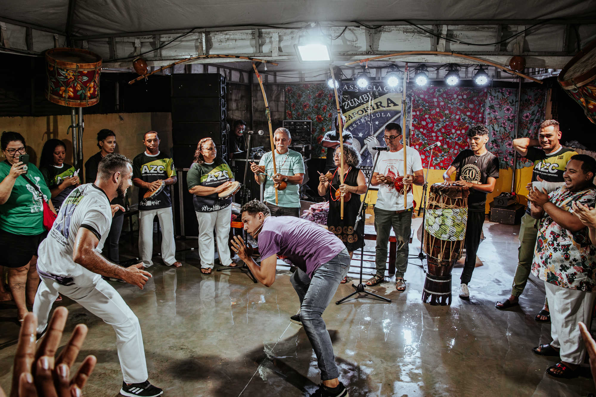 Depois do lanche, a programação seguiu para o espaço da Associação Zumbi Capoeira. Mestra Carla e mestre Lula contaram um pouco da história e atuação da AZC na formação de jovens capoeiristas e, em seguida, o local foi tomado por apresentações artísticas do grupo Toque de Senzala e da própria Associação Zumbi Capoeira, que finalizou a noite chuvosa com uma roda de capoeira.