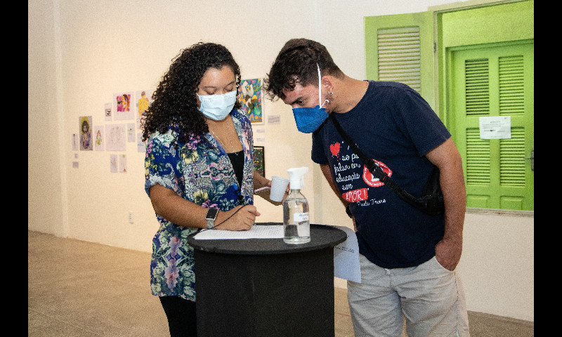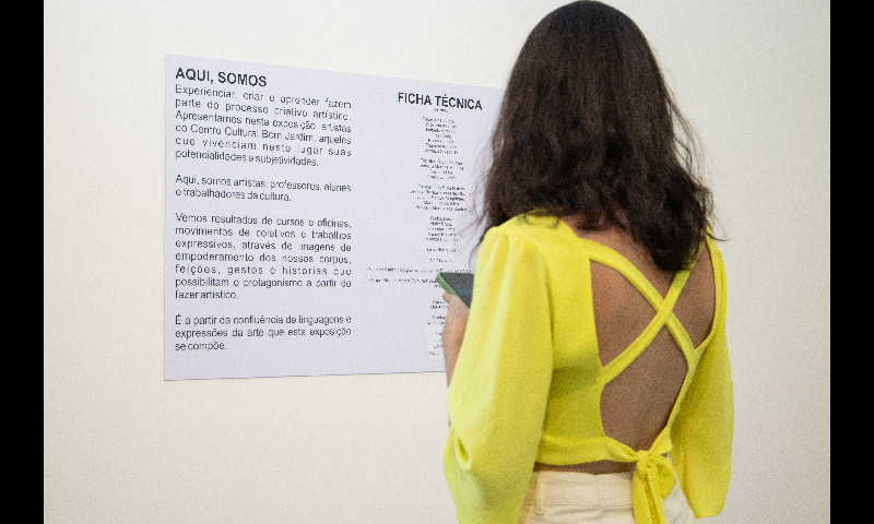 Aqui, somos artistas, professores, alunes e trabalhadores da cultura. Experienciar, criar e aprender fazem parte do processo criativo artístico. Vemos resultados de cursos e oficinas, movimentos de coletivos e trabalhos expressivos, através de imagens de empoderamento dos nossos corpos, feições, gestos e histórias que possibilitam o protagonismo a partir do fazer artístico. É a partir da confluência de linguagens e expressões da arte que esta exposição se compõe.