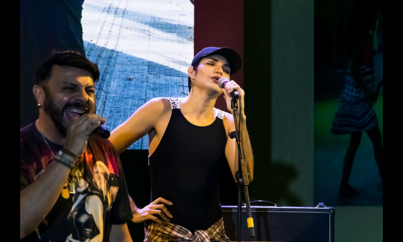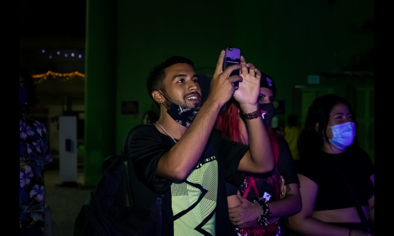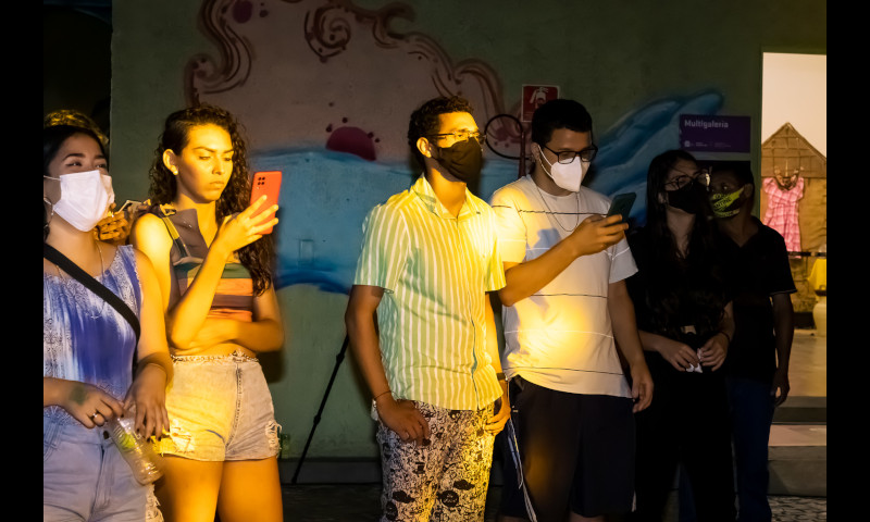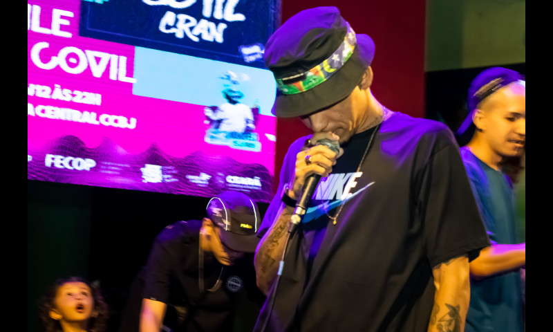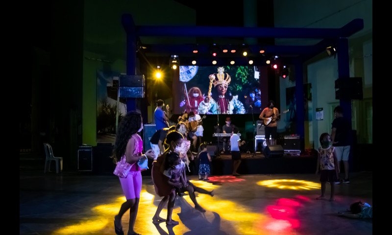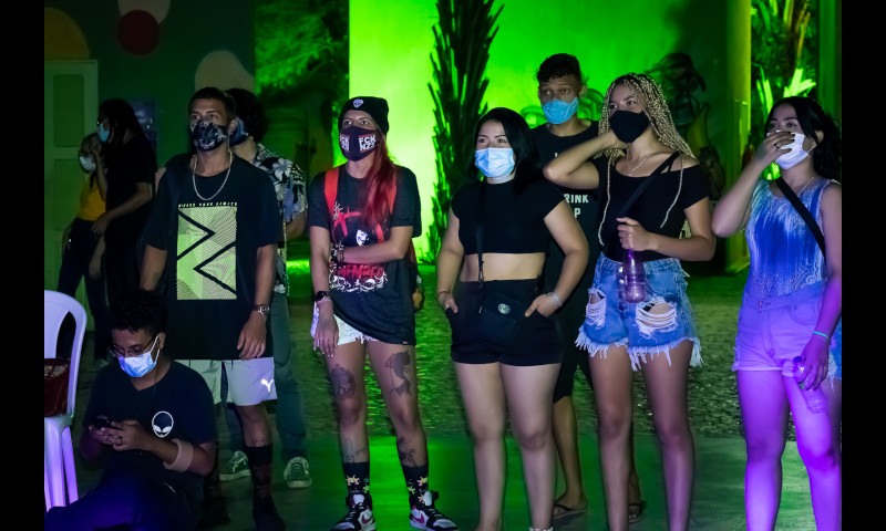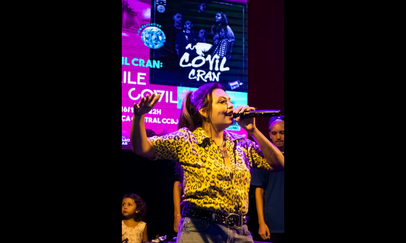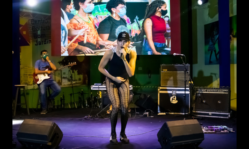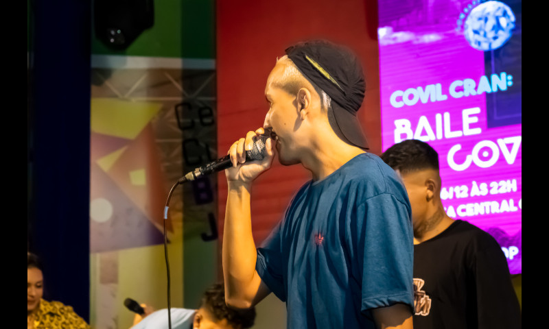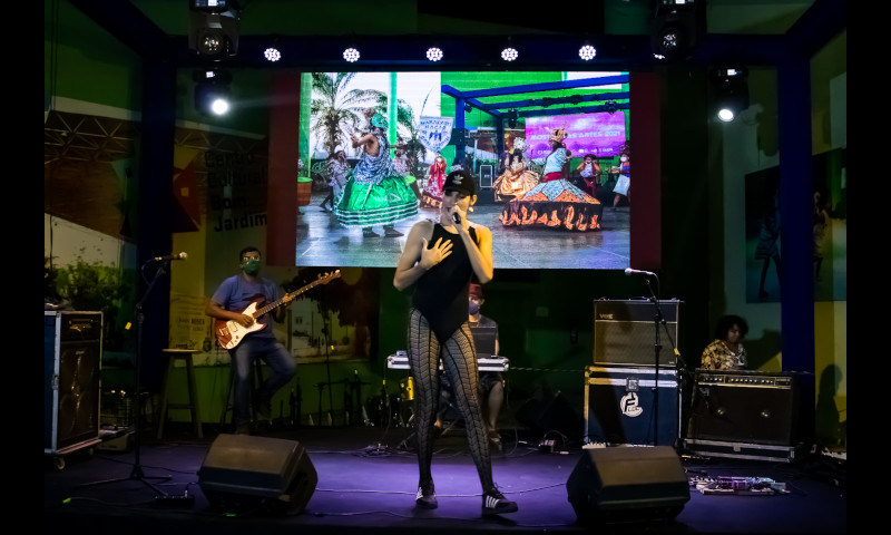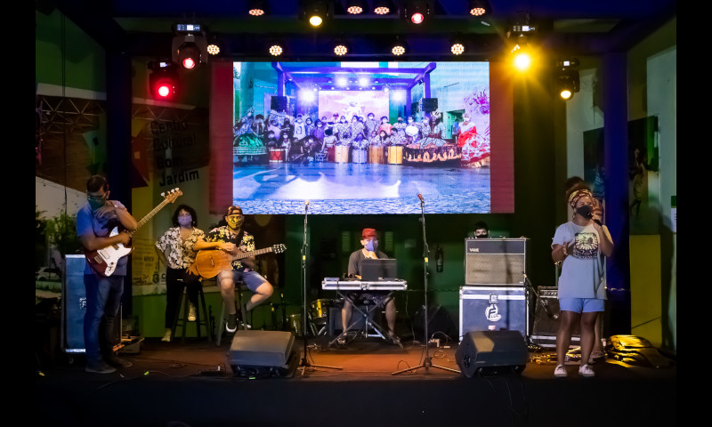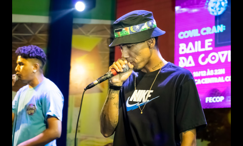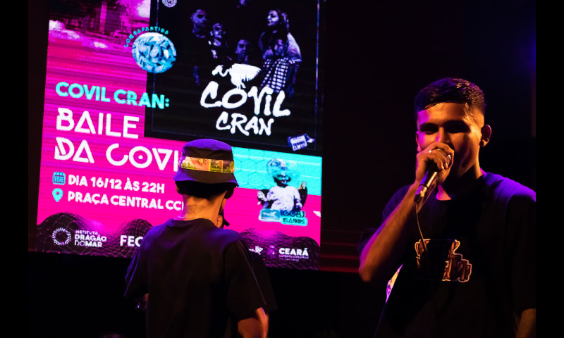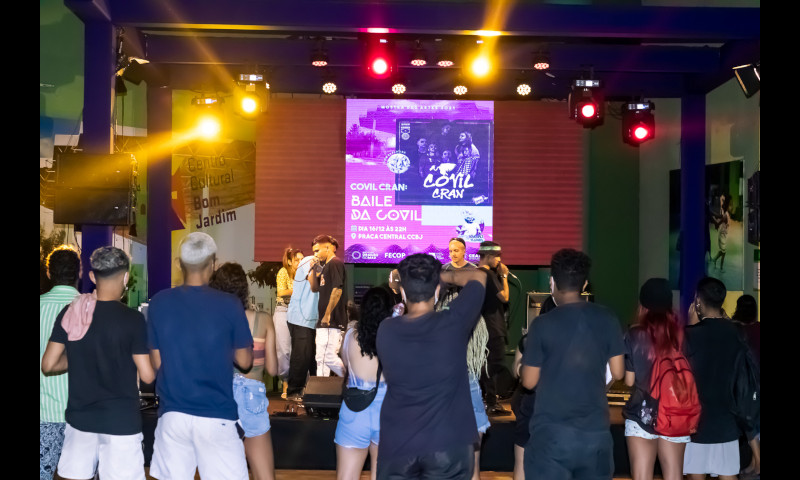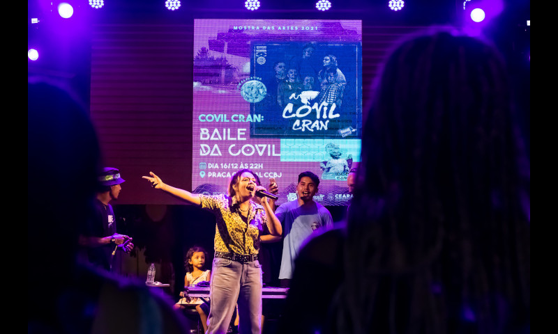 Finalizando o terceiro dia de Mostra das Artes 2021, na Praça Central do CCBJ tivemos a apresentação do Baile da Covil, organizado pelo coletivo Covil Cran, como forma de contrapartida da Convocatória Pública para Manutenção das Atividades Artísticas e Culturais de Grupos e Coletivos do Grande Bom Jardim. O grupo tocou as faixas já disponíveis no canal no YouTube, além de alguns lançamentos.