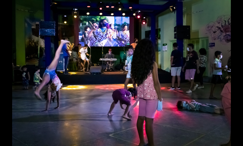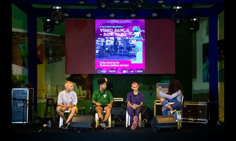 O grupo Sou’l Street apresentou no palco da Praça Central do CCBJ a videodança “Diálogo”, produzia pelo grupo como contrapartida da Convocatória Pública para Manutenção das Atividades Artísticas e Culturais de Grupos e Coletivos do Grande Bom Jardim. Após a exibição da videodança, o grupo participou de um bate-papo sobre os processos de produção do material, o trabalho do grupo e o impacto da convocatória nas produções da Soul’Street. A mediação ficou por conta de Jô Costa, apresentadora da Mostra das Artes 2021.